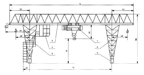1、葫蘆起升機構 2、支腿 3、大車運行機構 4、主梁 5、司機室 6、梯子、平臺欄桿安裝